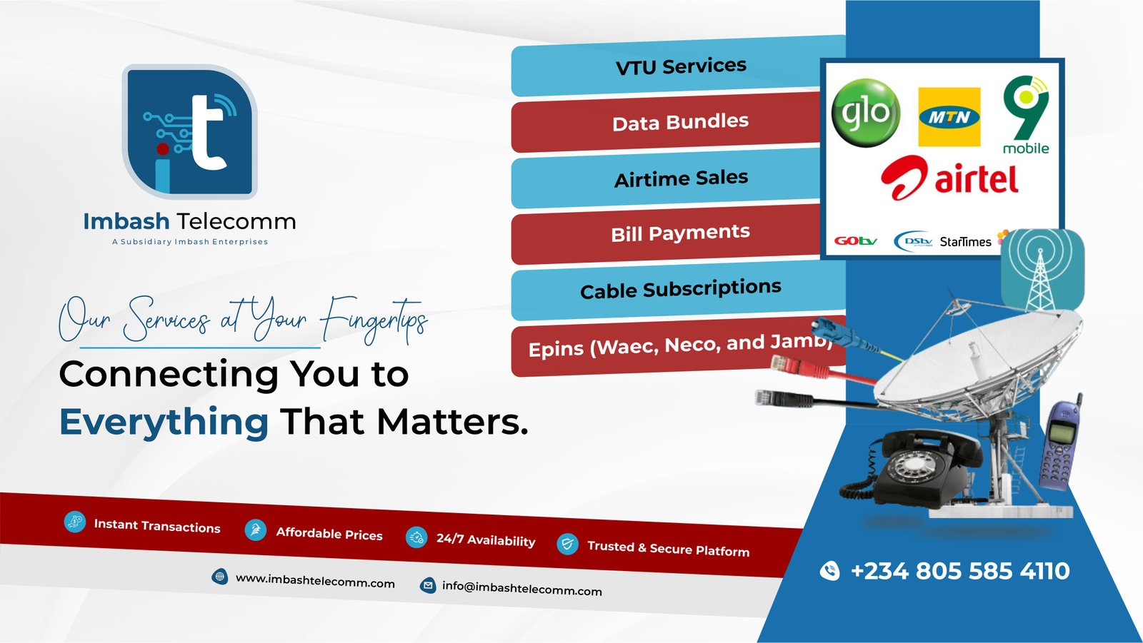 Imbash Telecomm is a leading Virtual Top-Up (VTU) provider in Nigeria, dedicated to making everyday payments easier, cheaper, and faster. We believe in empowering individuals, businesses, and agents with reliable technology to carry out transactions anytime, anywhere.